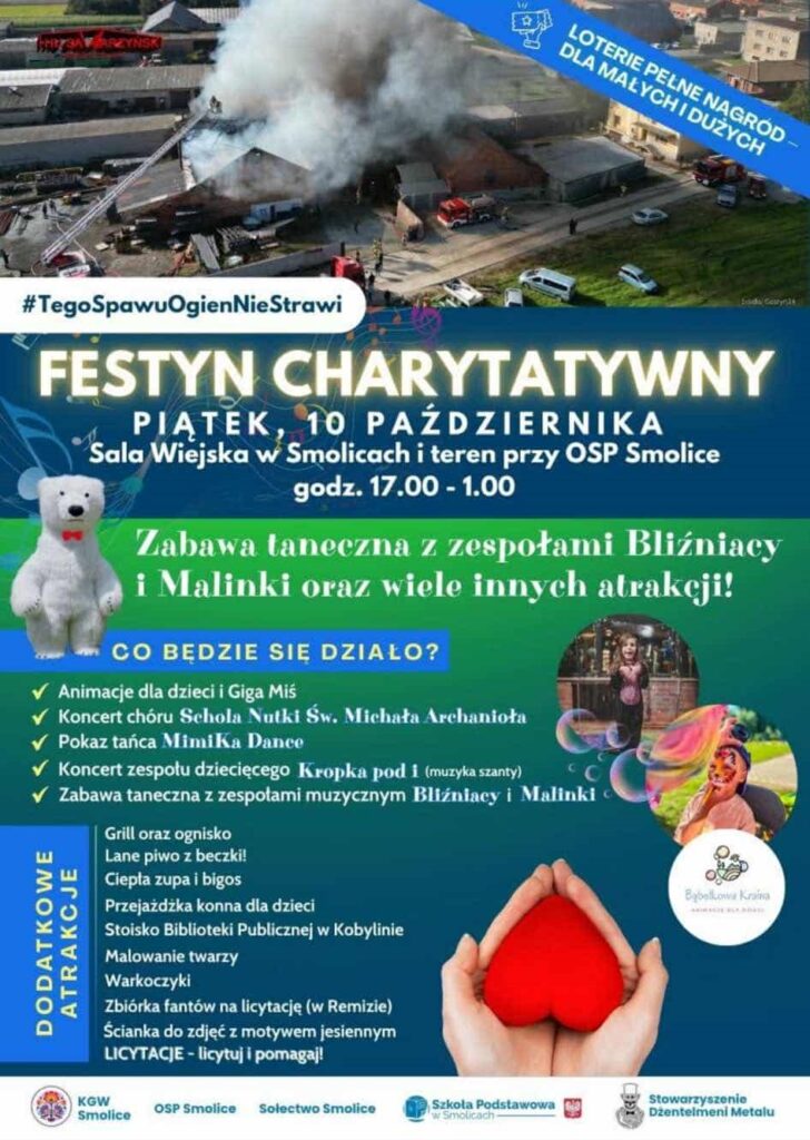 3 października, w piątek doszło do pożaru zakładu ślusarskiego, produkującego kotły centralnego ogrzewania w Czeluścinie. Spłonęła hala produkcyjna firmy FHU Sawarzyński – dorobek całego życia Adriana Sawarzyńskiego. Akcja gaśnicza trwała kilka godzin, a straty po pożarze oszacowano na ponad milion złotych. Firma ta jest szczególnie bliska naszemu festiwalowi, ponieważ Adrian jest jednym z naszych pierwszych sponsorów. Teraz role mogą się nieco odwrócić i to my mamy szansę wesprzeć go w odbudowie strat.